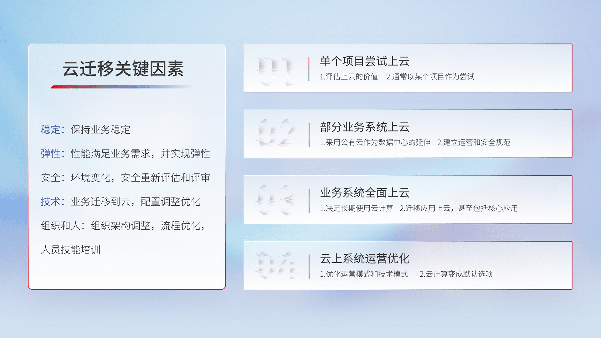 结合实际业务,,从规划设计、、云平台选型、、云原生改造、、、、数据迁移、、、、集成交付,,,,迁移全过程为客户识别最佳上云路径,,,做好风险识别管理,,设计网络架构、、、、身份权限、、、安全审计合规、、操作审计、、日志审计、、、监控告警策略、、、多站点容灾设计等,,,,对云上基础设施进行整体规划,,,提升IT治理水平,,以满足弹性、、高可用、、高性能的需求。。